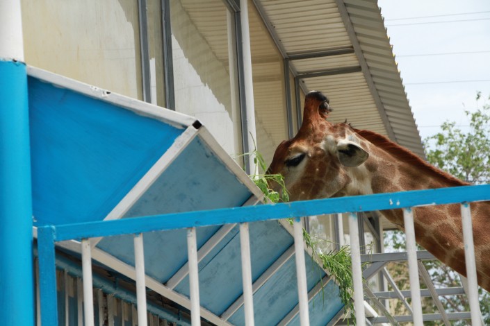 Вот он на фото. Этот снимок сделан в июне 2016 года. Но сейчас жирафа нет. Городские власти посчитали, что тропическому животному не место в центре города. Животное отвезли в Россию.