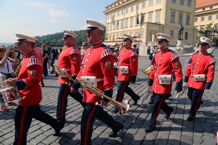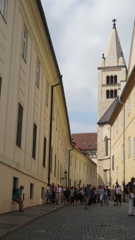 Мы, имея в запасе всего несколько часов, сразу же направились к Пражскому граду, самому большому дворцовому комплексу, занесенному в Книгу рекордов Гиннесса. В нем и сейчас расположена резиденция президента. Каждый час у входа можно увидеть торжественную смену караула. Почетный караул стоит в маленьких будках по две стороны от входа.