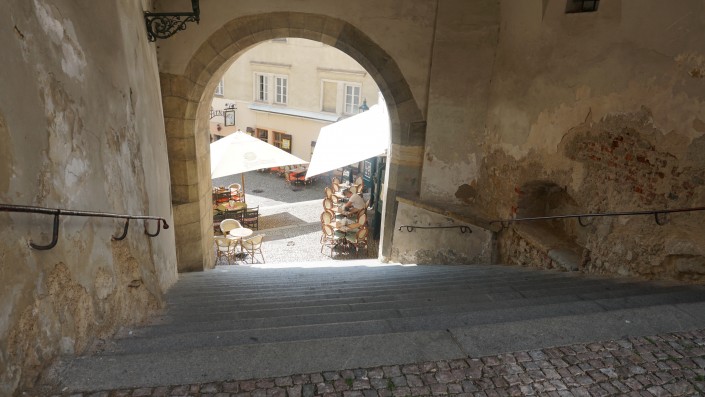 Если пройти дальше, можно выйти на улицу Винную, где расположена самая узкая улочка. На ней два человека не разойдутся, поэтому тут установлен светофор.