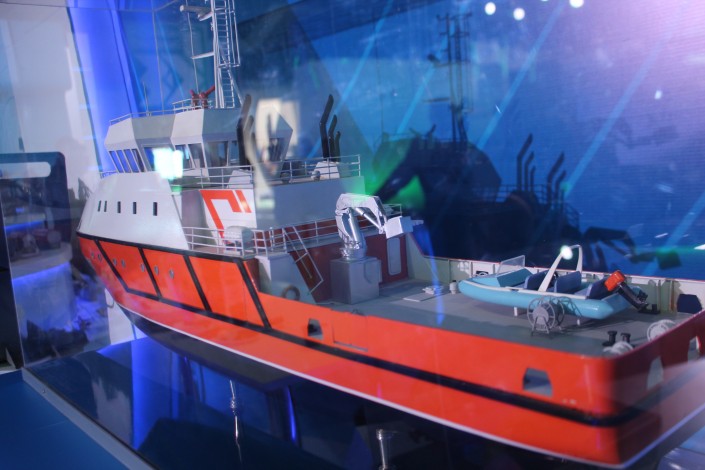 А вот АО "НИИ "Гидроприбор" удивило посетителей не только моделями катеров. Представители научного института продемонстрировали модельный ряд подводных мин и комплексы для подготовки водолазов.
