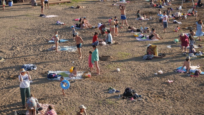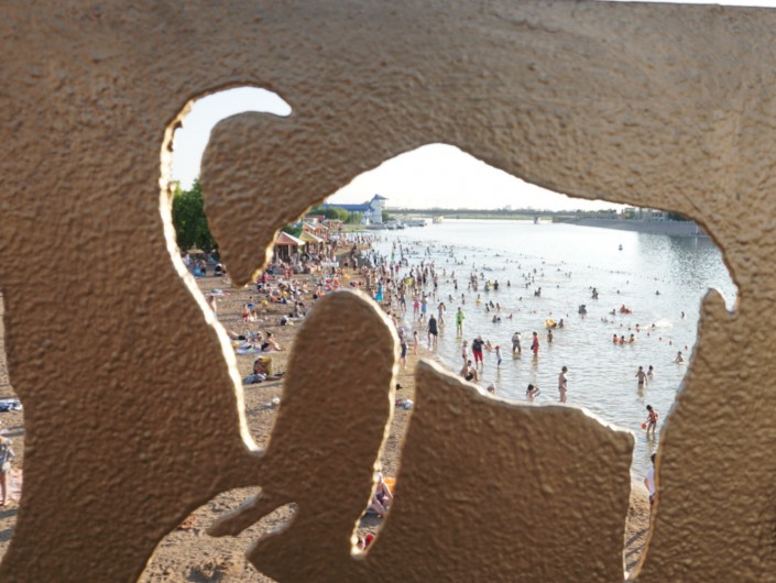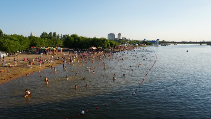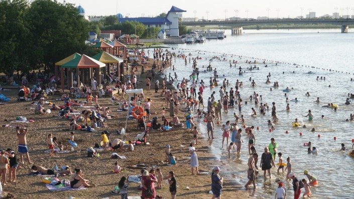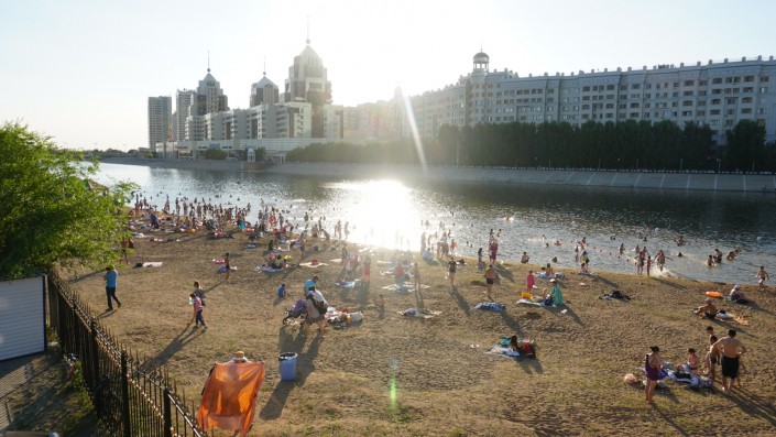 В тот же вечер мы наведались и на городской пляж на реке Есиль. Видно, что там яблоку негде упасть.