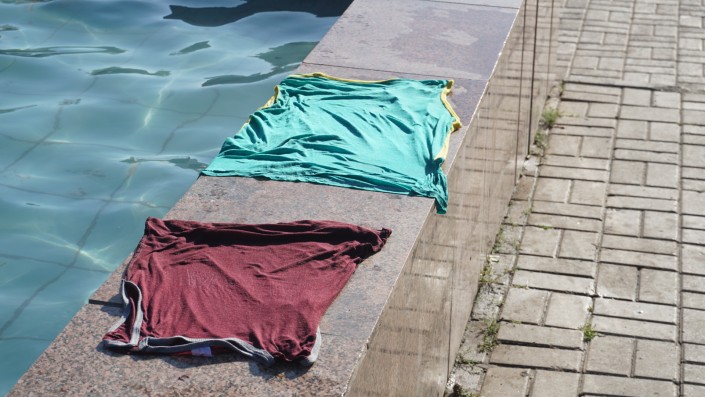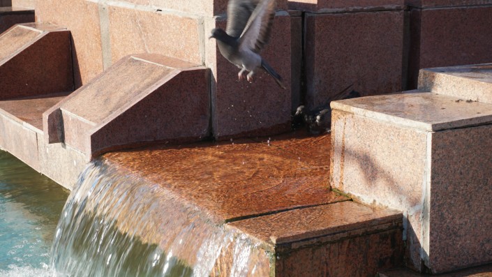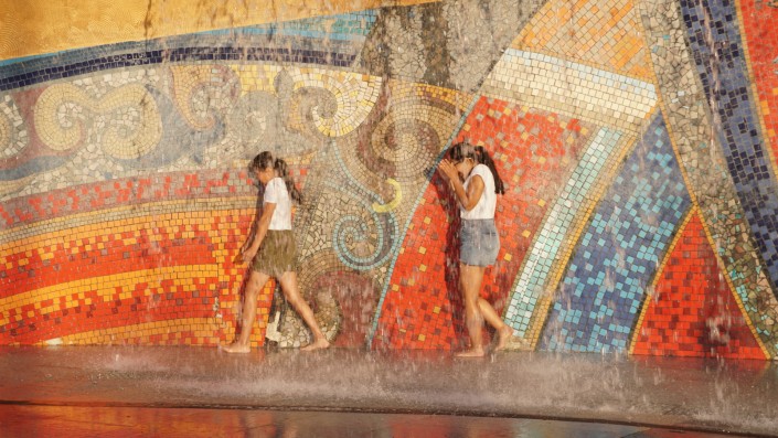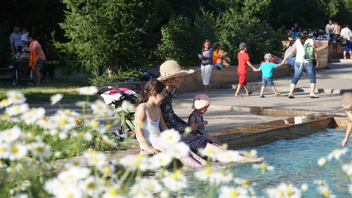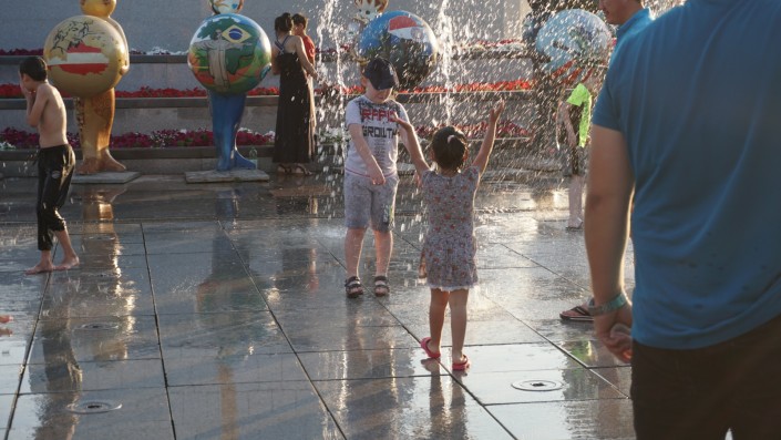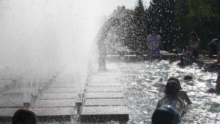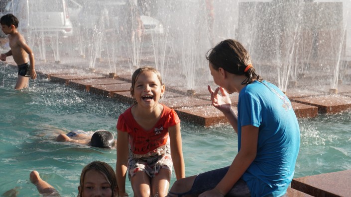 От буквально раскаленного воздуха не выдерживают и взрослые, и они тоже нет-нет да и заходят в фонтан, хотя бы чтобы помочить ноги.
