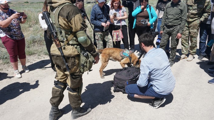 Акира почти сразу нашла имитатор взрывчатки, который военнослужащие незаметно положили в рюкзак одного из телеоператоров. Таким образом саперы хотели показать способность бельгийской овчарки находить опасные предметы, куда бы их ни спрятали.