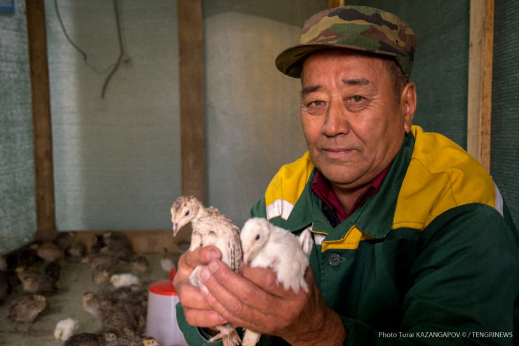 "Кормим их простоквашей", - заботливо говорит птицевод Сейдолла Абильдин, глядя на птиц, которым всего пятнадцать дней от роду. Он работает с фазанами уже восемь лет.