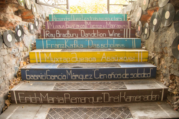 "Идея оформить лестницу в виде корешков книг пришла к нам в одной из поездок. Мы вдумчиво подошли к выбору авторов в этом списке. Особенно важным для нас было присутствие классика казахской литературы - Мухтара Ауэзова", - рассказала владелица.