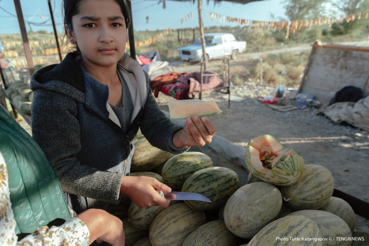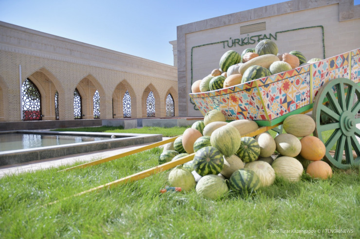 В Туркестане было немного ветрено, но все же солнечно. О том, что это юг, напоминал зеленый газон и полная телега с дынями и арбузами.