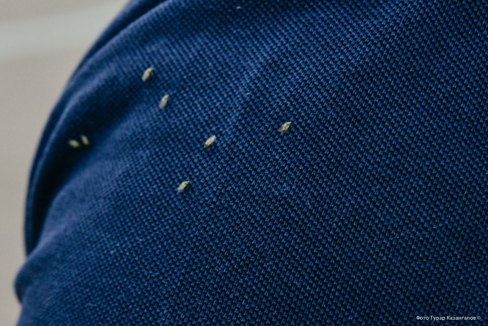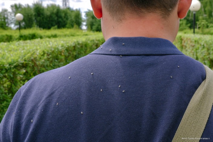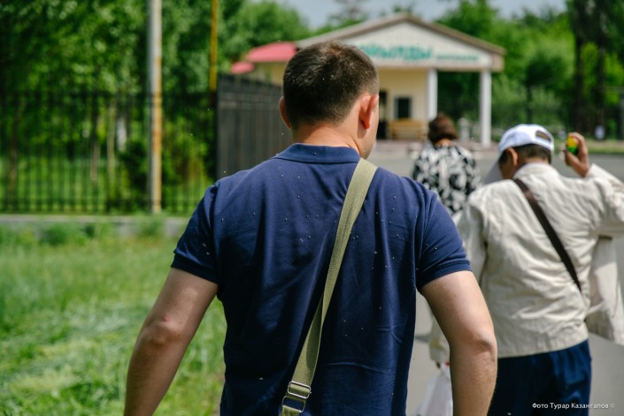 В отличие от предыдущих фото, верхний снимок сделан уже не в самом Павлодаре, а в поселке, который к нему примыкает - Мойылды. Обратите внимание на мою спину (корреспондент Tengrinews.kz) на переднем плане. У прохожего на втором плане такого скопления гнуса нет, очевидно, это благодаря тому, что тот распыляет на себя какой-то спрей.