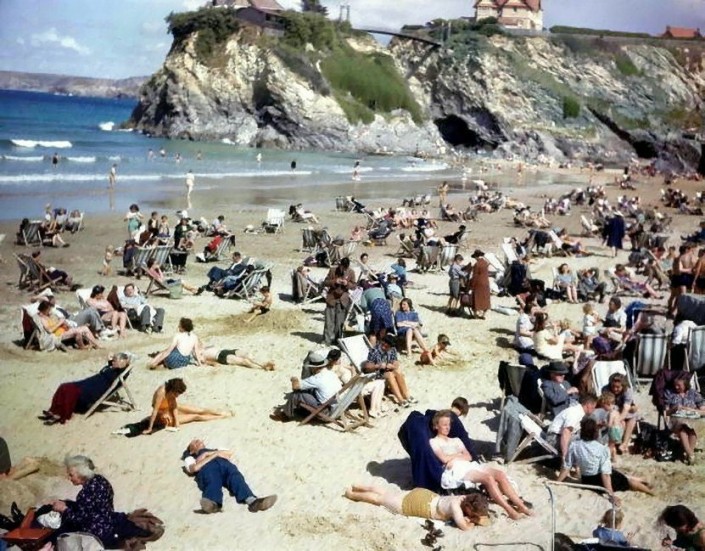 На снимке запечатлены британские рабочие, отдыхающие на пляже в Корнуолле. В центре можно заметить высокого человека, который держит в руках неизвестный предмет и внимательно в него вглядывается.