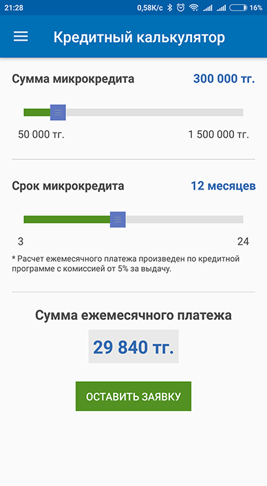Чтобы оставить заявку, необходимо указать в приложении необходимую информацию – сумму микрокредита и срок погашения. При этом встроенный калькулятор заранее рассчитает ежемесячный платеж. После отправления заявки, связываются специалисты call-центра для уточнения деталей и последующей выдачи микрокредита.