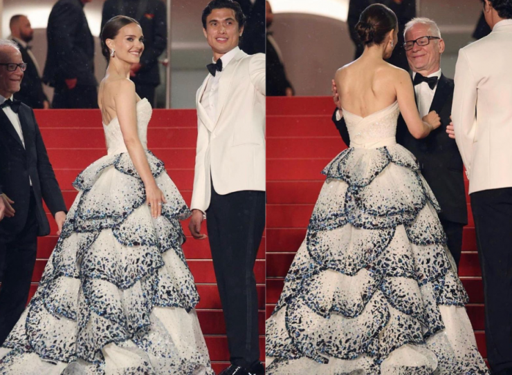 Портман позировала перед каннскими фотографами в реплике винтажного платья Dior из коллекции 1949 года. Наряд состоит из сверкающего корсета и пышной юбки в виде бутона цветка. Образ Натали дополнила серьгами из белого золота с бриллиантами, а волосы собрала в элегантный низкий пучок.