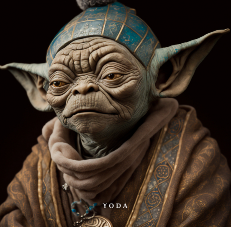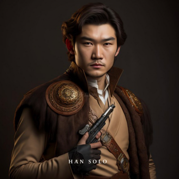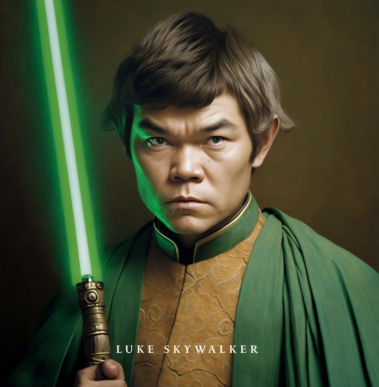 С помощью искусственного интеллекта Midjourney удалось представить ряд героев: Люка Скайуокера, Дарта Вейдера, Йоду, Хана Соло и других, сгенерировав их черты лица к азиатскому типажу. Таким образом, джедай Люк не лишился светлых волос, однако его глаза стали карими, а лицо более округлым.