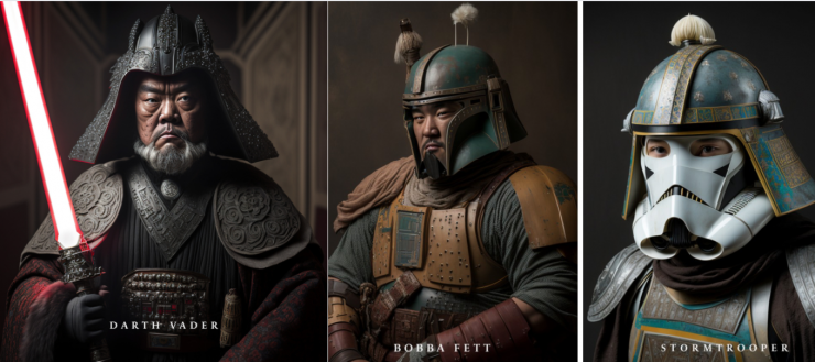 В версии искусственного интеллекта Дарт Вейдер, Чубакка и штурмовики облачились в боевые доспехи с орнаментом, похожим на казахский, однако они не потеряли своей футуристической эстетики.