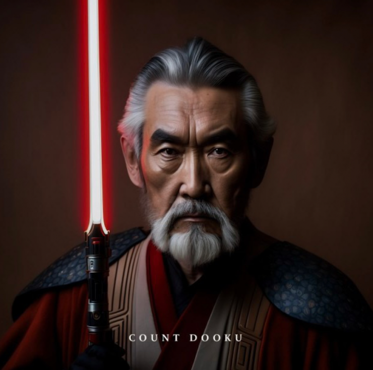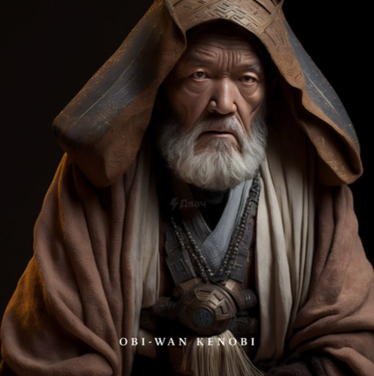 Что касается Оби-Вана Кеноби, то в версии Midjourney он не походит на красавчика актера Юэна Макгрегора, которого привык представлять себе зритель. На сгенерированном снимке взят прототип уже постаревшего мастера-джедая, которого сыграл Алек Гиннесс.