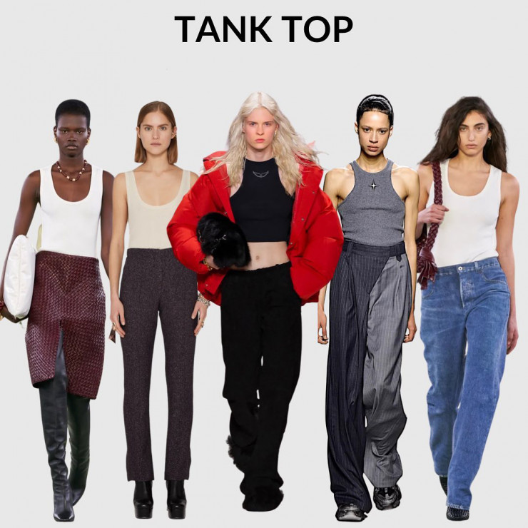 Вместе с мини-юбками, которые выглядят довольно по-летнему, остаются с нами осенью и майки. Конечно, они служат как один из слоев образа.