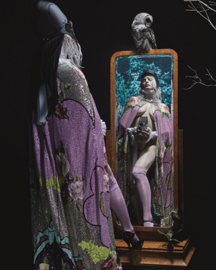 Эмили Ратаковски в черном драматичном образе с роскошными кружевами, в необычной шляпе и с зеркалом в руках вызвала восторг у пользователей сети. Ее образ, по словам создателей, "олицетворял писательницу". Однако поклонники не разглядели на снимках ничего, относящегося к литературе.