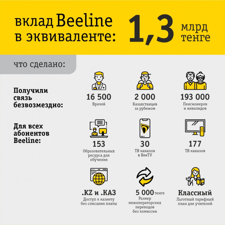 Больше 16 000 медицинских работников обеспечены связью Beeline: 1000 минут для звонков на любые номера по Казахстану и 100 ГБ интернет-трафика. Отменено списание платы за мобильную связь у пенсионеров и людей с ограниченными возможностями на время карантина по тарифам "Социальный" и "Со-общение+".