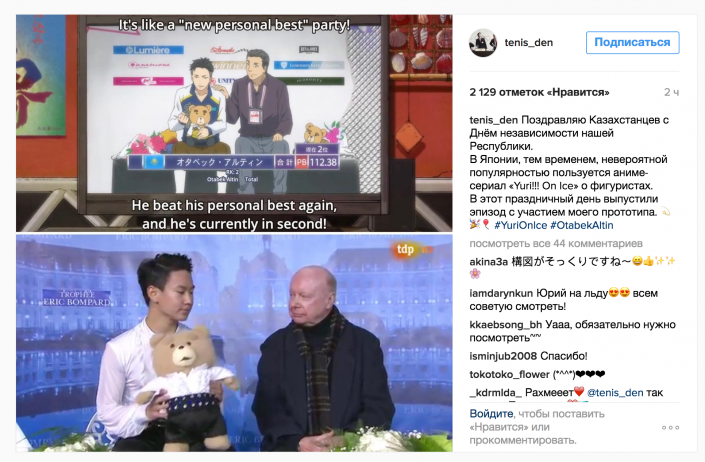 "Поздравляю казахстанцев с Днем независимости нашей Республики. В Японии, тем временем, невероятной популярностью пользуется аниме-сериал Yuri On Ice о фигуристах. В этот праздничный день выпустили эпизод с участием моего прототипа", - написал Тен в Instagram.