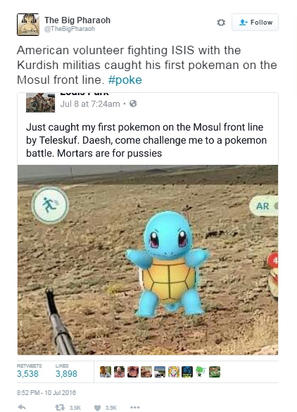 Американец Джонатан Терио прославился тем, что увлеченно ловил покемонов рядом с женой, которая вот-вот должна была родить, а американский доброволец ловил покемонов в перерывах между боями с ДАИШ.