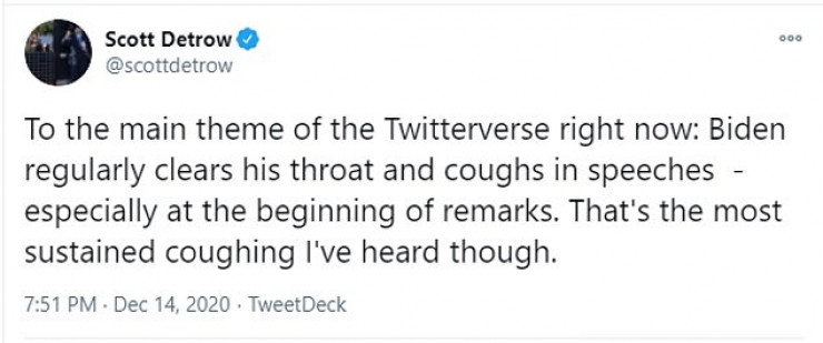 "Байден регулярно прочищает горло и кашляет в речах, особенно в начале выступления. Это самый продолжительный кашель, который я слышал", - написал политический корреспондент Скотт Детроу.