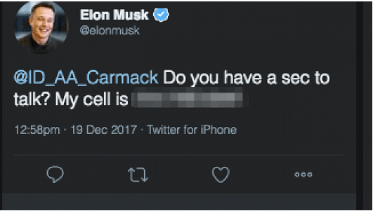 По данным агентства, Маск собирался отправить сообщение с номером техническому директору компании Oculus Джону Кармаку.