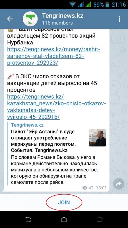 Адрес канала - telegram.me/tengrinews . Чтобы подписаться на него, нужно со своего смартфона кликнуть на ссылку, она откроется через мессенджер. После этого достаточно будет нажать на кнопку Join ("Присоединиться"). Есть второй способ - в Telegram нужно нажать на иконку поиска и ввести в строке полное название канала - Tengrinews. Программа найдет нужный канал. В него нужно будет зайти и программа сама предложит подписаться.