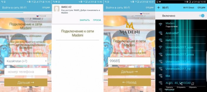Во Дворце спорта и культуры имени Балуана Шолака, где сейчас проходят игры зимней Универсиады, есть доступ к бесплатному Wi-Fi столовой Madeni, которая расположена в этом же здании. Для входа в Сеть необходимо сперва поставить галочку, что вам есть 18 лет, затем вбить номер мобильного телефона и дождаться код доступа. После этого полученный пароль нужно ввести в следующее окошко и нажать "Дальше". Только после этой процедуры можно будет выйти в Интернет.