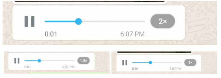 WhatsApp предлагает три скорости для голосовых сообщений - с ускорением 1х (оригинальная скорость), 1,5х и 2х. Скорости можно переключать с помощью соответствующей кнопки при прослушивании сообщения.