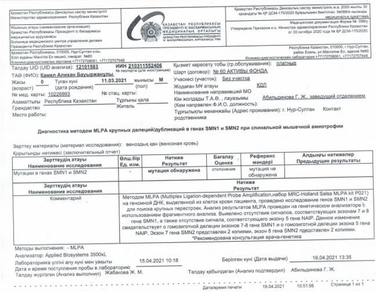 Жұлын-бұлшықет атрофиясы деген ауру бар, оған бір ғана екпе көмектеседі. Бірақ бұл екпені салдыру үшін 1 миллиард теңге қажет. Астаналық Әлихан Камел есімді кішкентай тұрғын өмірге келе салысымен осы аурумен күресіп жатыр. Tengrinews.kz тілшісі Әлиханның әкесі Бауыржан Камелмен сөйлесіп, ұлының жағдайын білді.