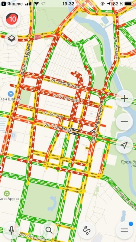 Сервис Яндекс.Карты отображает 10-балльную загруженность на центральных дорогах столицы. Заторы образовались на проспекте Республики, улицах Кенесары, Валиханова, Иманова, Бараева, Кунаева, на проспектах Абая, Богенбай батыра и Туран, улице Акмешит.
