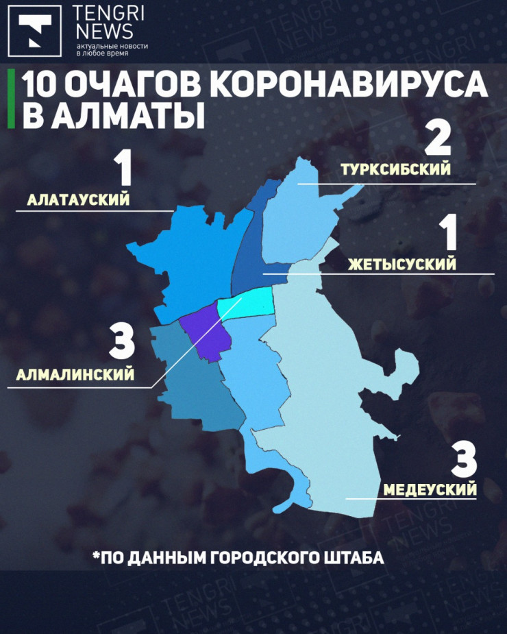По результатам эпидемиологического исследования, на территории Алматы выявлены 10 очагов COVID-2019: три в Алмалинском районе, три - в Медеуском, два - в Турксибском и по одному в Жетысуском и Алатауском районах.