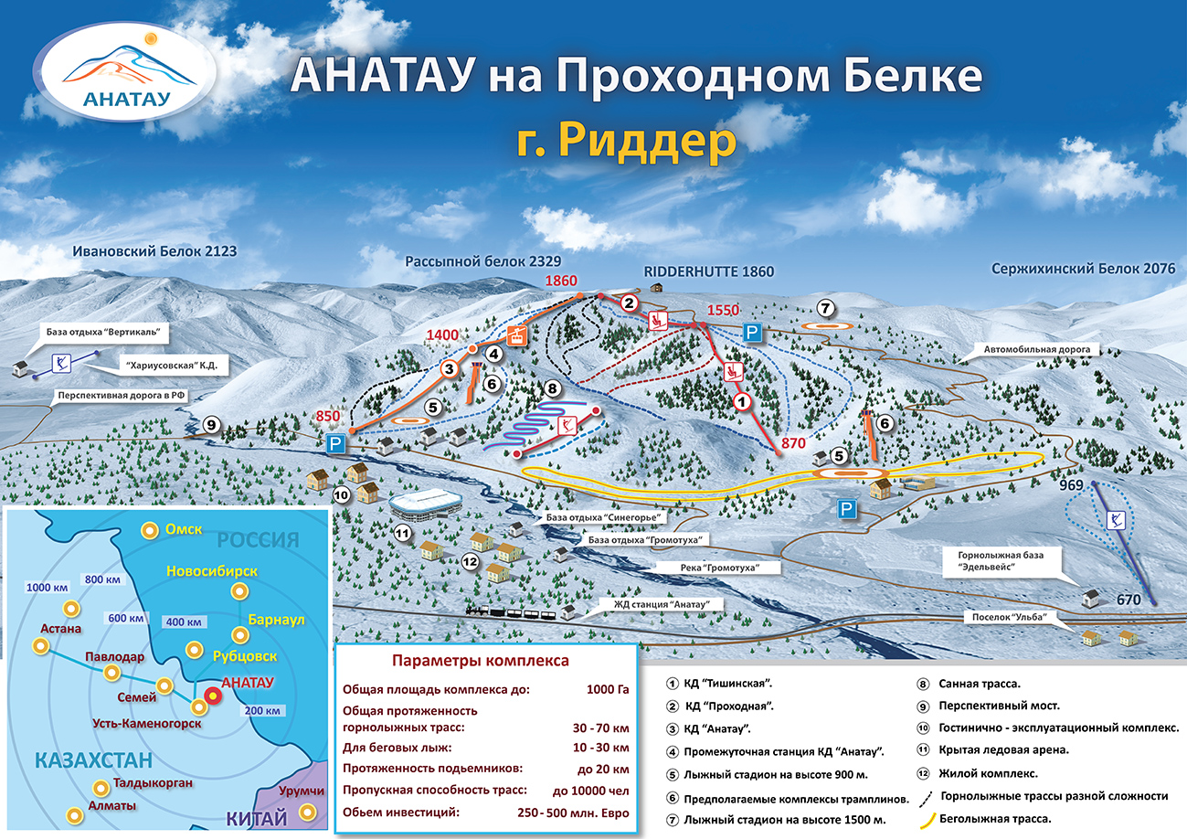 Лыжный комплекс "Анатау" планируют построить в Алтайских горах. По словам собеседника, склоны горнолыжного курорта смогут легко разместить трассы разной сложности с суммарной протяженностью до 100 километров. "От вершины "Анатау" (1860 метров над уровнем моря. - Прим. автора) почти по всем радиальным направлениям возможна установка канатных дорог, кабинных, бугельных и кресельных с перепадом до тысячи метров по высоте и протяженностью до пяти километров. В западном направлении от вершины, на высоте 1500 метров, можно расположить биатлонно-лыжный стадион с развитой инфраструктурой. Инфраструктуру комплекса намечается разместить у подножия северо-западного и северного склонов, а также на верхних участках в западном направлении от вершины на высоте 1300-1500 метров", - рассказал Швагерус.