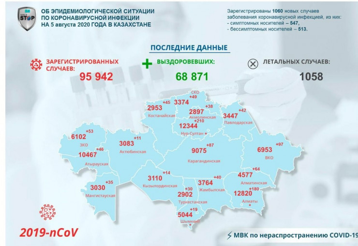 За прошедшие сутки (по данным на 5 августа) в Казахстане выявлено 1060 заболевших коронавирусной инфекцией, передает Tengrinews.kz.