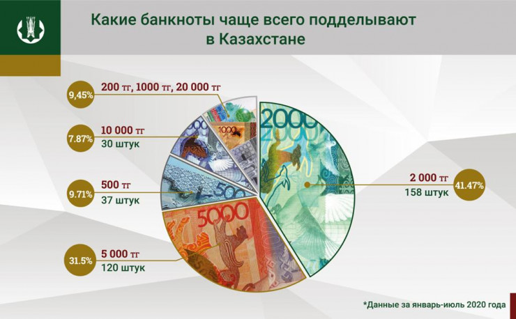 Наибольшее количество поддельных банкнот было выявлено в Алматы – 243 фальшивые купюры, или 63,78 процента. При этом чаще всего в Казахстане в 2020 году подделывались банкноты номиналом 2 тысячи тенге (41,47 процента) и 5 тысяч тенге (31,5 процента).