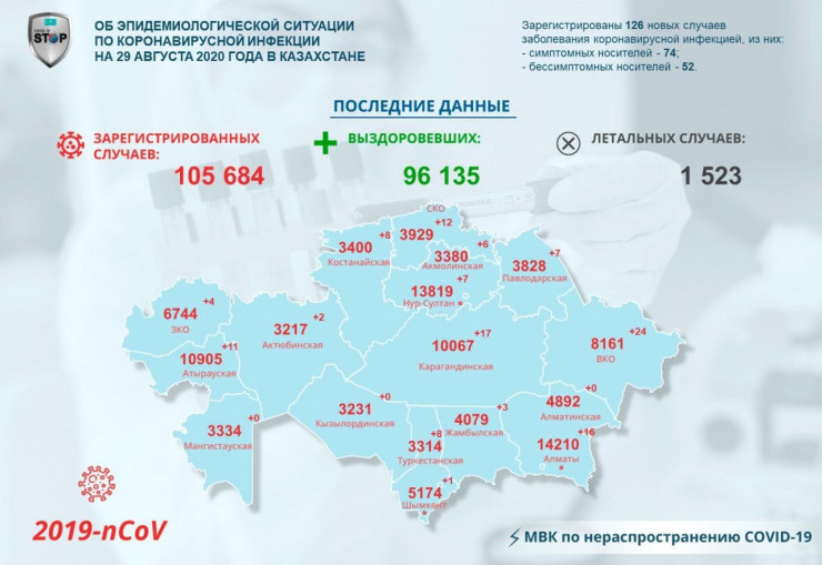 В Казахстане за прошедшие сутки (по данным на 29 августа) выявлены 126 новых случаев заболевания коронавирусной инфекцией, сообщает Tengrinews.kz.