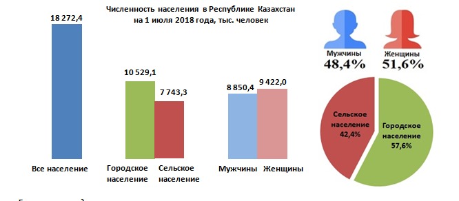 Численность населения страны на 1 июля 2018 года составила 18 272,4 тысячи человек, в том числе городского - 10 529,1 тысячи человек (57,6 процента), сельского - 7 743,3 тысячи человек (42,4 процента). По сравнению с 1 июля 2017 года численность населения увеличилась на 238,1 тысячи человек, или 1,3 процента.