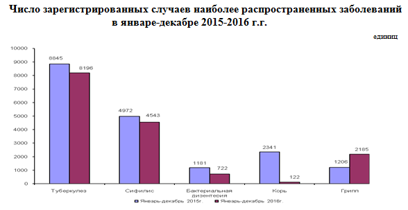 Также в 2016 году зарегистрировано 19 случаев заболевания сибирской язвой. Наибольшее распространение среди зарегистрированных инфекционных заболеваний на 100 000 населения получили острые инфекции верхних дыхательных путей - 4368,3 (в соответствующем периоде 2015 года - 4036,5), острые кишечные инфекции - 68,7 (74,8), туберкулез органов дыхания - 46,4 (50,4), сифилис - 25,7 (28,4), вирусные гепатиты - 3,1 (3,3).