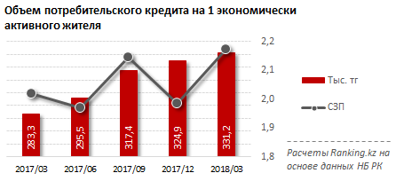 Уровень потребительской закредитованности к концу марта 2018 года вырос за год на 16,9 процента и составил 331,2 тысячи тенге на одного экономически активного жителя, или 2,2 среднемесячных заработных платы (годом ранее - две).