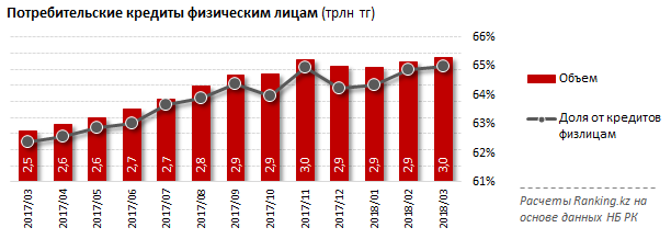 Объем кредитования физических лиц за год вырос на 13,3 процента (и на 0,7 процента с начала года) и составил на конец марта 2018 года 4,6 триллиона тенге.
