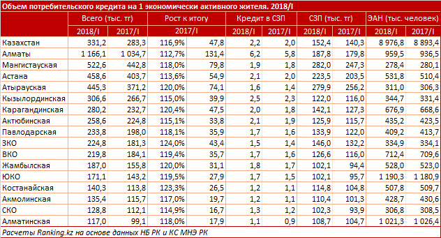 По регионам Казахстана самыми закредитованными являются алматинцы - на одного экономически активного жителя финансового центра приходится 1,2 миллиона тенге (годом ранее - один миллион тенге) объема потребительской задолженности, или 6,2 месячных оклада (годом ранее - 5,8).