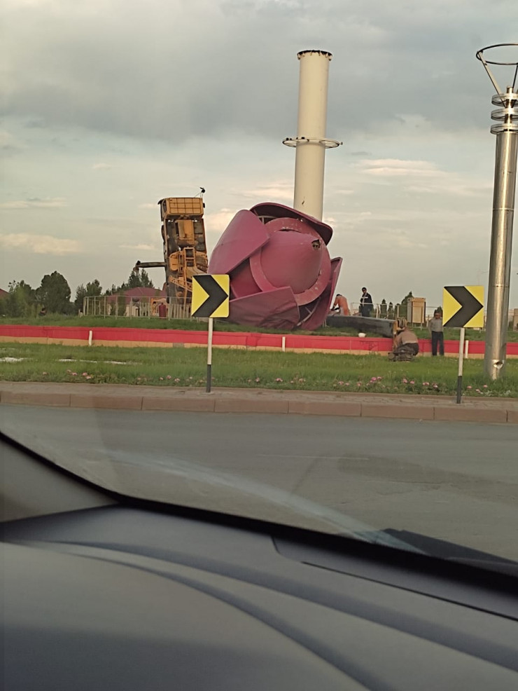 В соцсетях сообщили о падении строительного крана в ходе демонтажа скульптуры тюльпана высотой 25 метров. В частности, журналист Михаил Козачков в своем Telegram отметил, что тюльпан установили при прошлом акиме области Бердибеке Сапарбаеве к 25-летию независимости Казахстана в 2016 году, так как тюльпан является символом города. По предположению журналиста, при новом акиме тюльпан решили убрать вовсе или сделать еще выше - до 30 метров - уже к 30-летнему юбилею страны.