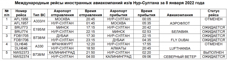 "8 января 2022 года из/в Нур-Султан иностранными авиакомпаниями планируется выполнение 6 международных рейсов в/из городов Дубай, Минск, Калининград и отменено выполнение 4 рейсов в/из городов Москва, Франкфурт", - сообщили в ведомстве.