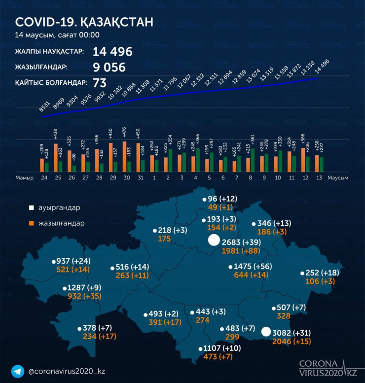 Всего в стране выявлено 14 496 заболевших, число выздоровевших пациентов увеличилось до 9056 человек. Летальных случаев - 73.