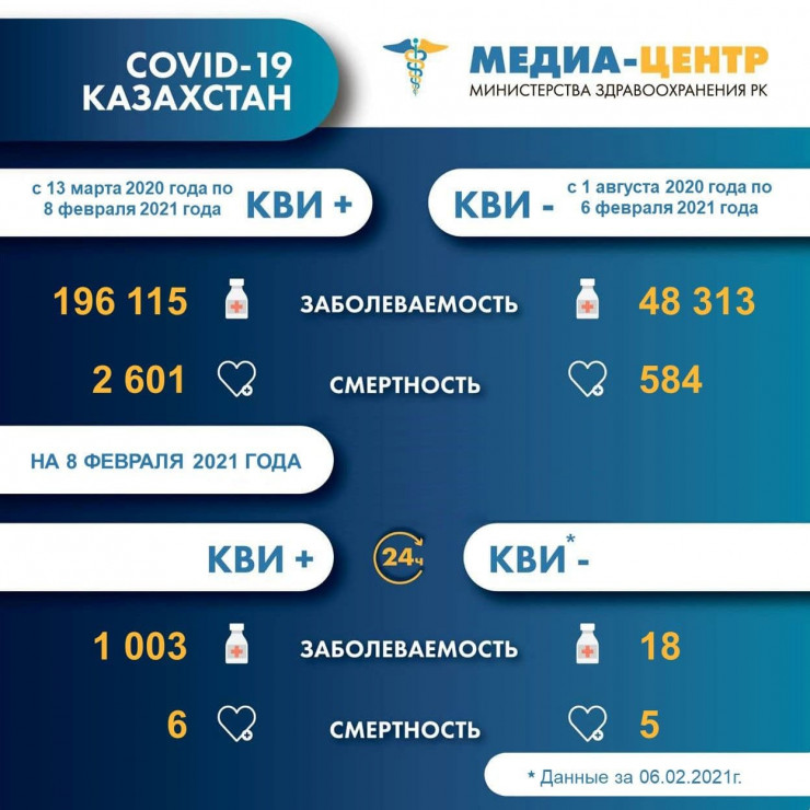 При этом от коронавируса COVID-19 за сутки умерли шесть казахстанцев (всего 2 601), а от пневмонии - пятеро (всего 584).