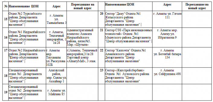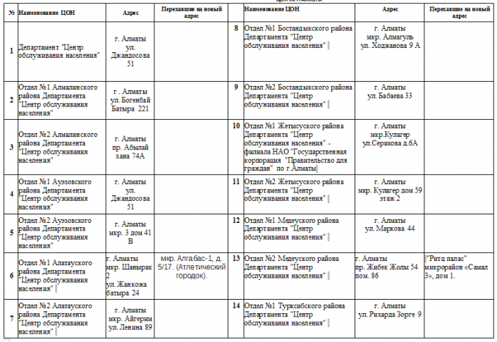 Так, отдел № 1 Алатауского района департамента "Центр обслуживания населения" переехал из микрорайона "Шанырак-2", улица Жанкожа батыра, дом 24 на новый адрес: микрорайон "Алгабас-1", дом 5/17 (Атлетический городок).