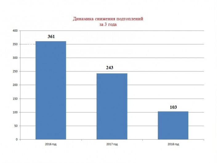 На территории города имеются наиболее часто подтапливаемые участки. Если в 2017 году их количество составляло 65, то уже в этом году угроза подтоплений частных жилых домов и улиц устранена на 45 участках. Таким образом, только за последний год в 3 раза снижено количество постоянно подтапливаемых участков.
