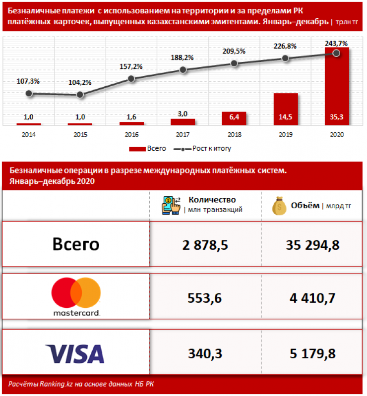 По их данным, больше всего безналичных транзакций в 2020 году в Казахстане было проведено через платежные карты системы MasterCard Worldwide. Это 553,6 миллиона транзакций на сумму 4,4 триллиона тенге, что составляет 19,2 процента от общего количества безналичных операций. В свою очередь, через карты платежной системы Visa International было проведено 340,3 миллиона безналичных транзакций на сумму 5,2 триллиона тенге,.