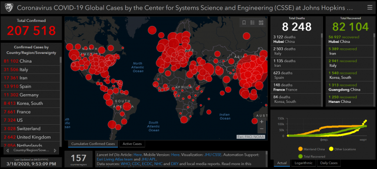 В мире число зараженных превысило 207 тысяч человек. Больные регистрируются в 157 странах. По-прежнему больше всего зараженных в Китае, однако цифра за последние сутки почти не изменилось - 81,1 тысячи человек. На втором месте Италия - 31,5 тысячи зараженных. На третьем месте Иран - более 17 тысяч больных.
