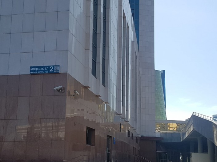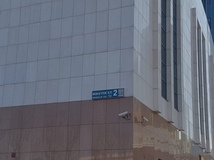 По мнению Ердена Кажыбека, правильная надпись на латинской графике должна быть такой: заглавными буквами - MÁŃGİLİK EL, строчными - Máńgilik El. Сейчас на указателе написано MANGILIK YEL.