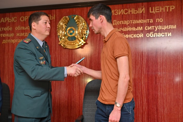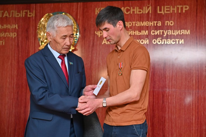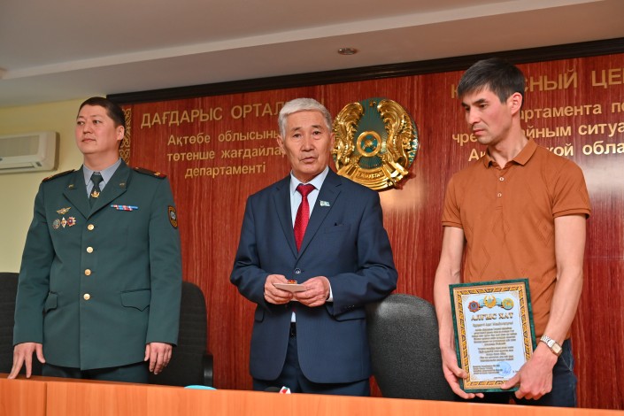 Спаситель получил из рук заместителя начальника ДЧС Кайрата Касыма благодарственное письмо, а также юбилейную медаль "100 лет пожарной охране" от председателя ветеранов ДЧС.