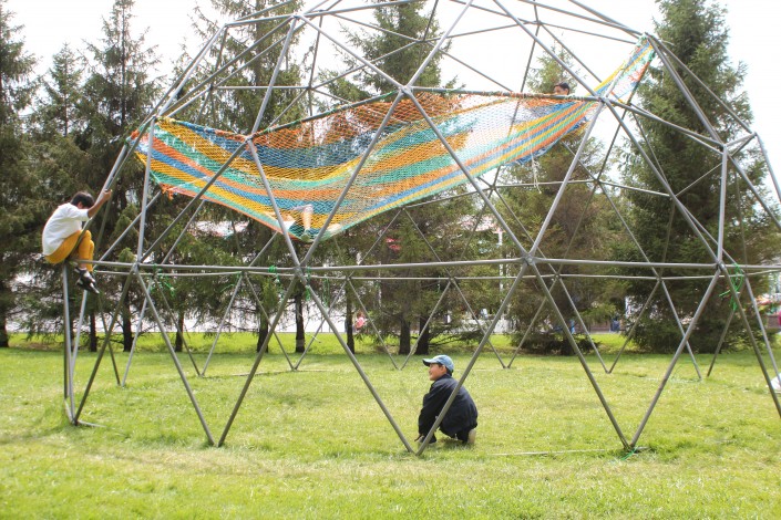 Металлические конструкции в виде юрты стоят на газоне. На них можно взбираться и отдыхать на натянутой разноцветной сетке.
